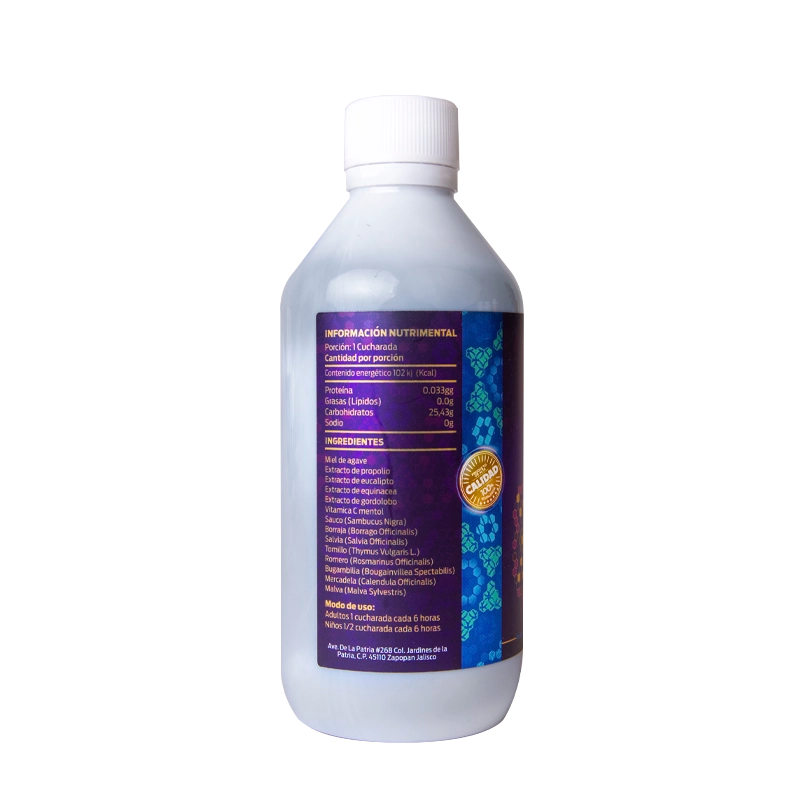 TO-CFIN esta hecho con miel de agave y extractos naturales como gordolobo y eucalipto, ejerciendo una acción antiséptica y expectorante.